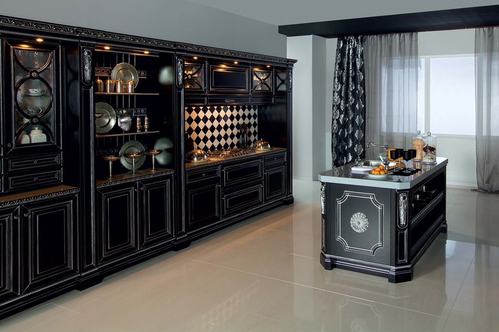 - Они способны зрительно расширять пространство. Да, все верно, черная кухня не только не сужает помещение, но даже делает его больше. Все дело в том, что черный способен придавать пространству глубину и выглядит не так массивно, как белый. Главное — правильно его применить.